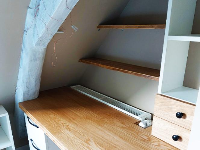 Toutes les finitions sont imaginées de façon à épouser les radiateurs actuels sans les empêcher de fonctionner. Les poutres des combles quant à elles ont aussi dû être prises en compte dans la composition final des espaces. Il y a eu de nombreuses découpes effectuées pour obtenir le résultat souhaité !