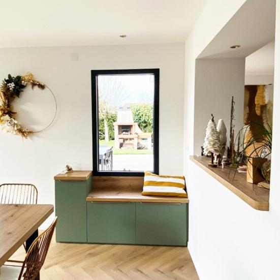 Un petit meuble discret, installé sous l’une des fenêtres, contre le mur, complète l’aménagement. Il permet de s’asseoir en profitant de la vue sur le jardin ou sur la cuisine, tout en offrant trois compartiments de rangement supplémentaires. Une solution simple et astucieuse, typique du regard d’un artisan.